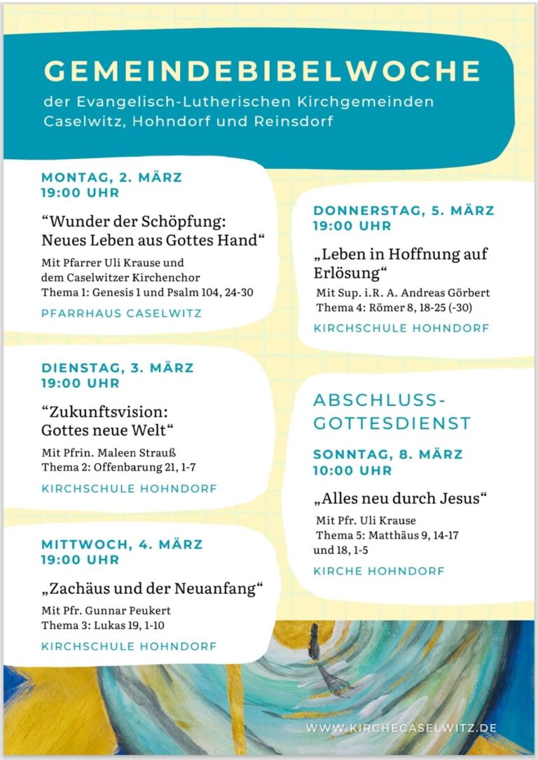 9. März + 23. März + 30 März jeweils um 20 Uhr im Pfarrhaus Caselwitz.