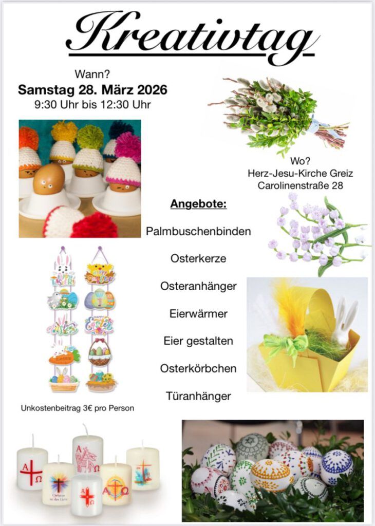Hast du schon ein Ostergeschenk oder möchtest du eine Osterkerze, Eierwärmer, Türdekorationen, Osterkörbchen, Ostereier oder ein Palmbuschen selbst basteln? Dann bist du herzlich eingeladen zum Kreativtag am 28. März ab 9:30 Uhr im Gemeindesaal der Katholischen Gemeinde „Herz Jesu“.